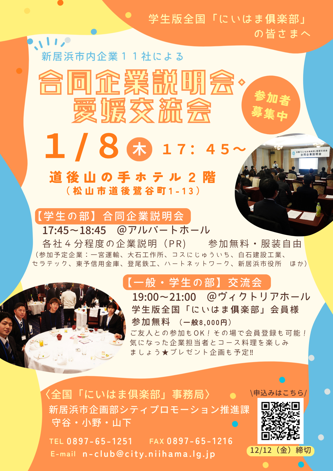 全国「にいはま倶楽部」では、毎年、会員間の情報交換や親睦を深めることを目的に、松山、東京、大阪で交流会を開催しており、今年度は以下の日程で愛媛交流会、東・西日本ブロック交流会を開催いたしますので、ぜひご参加ください。