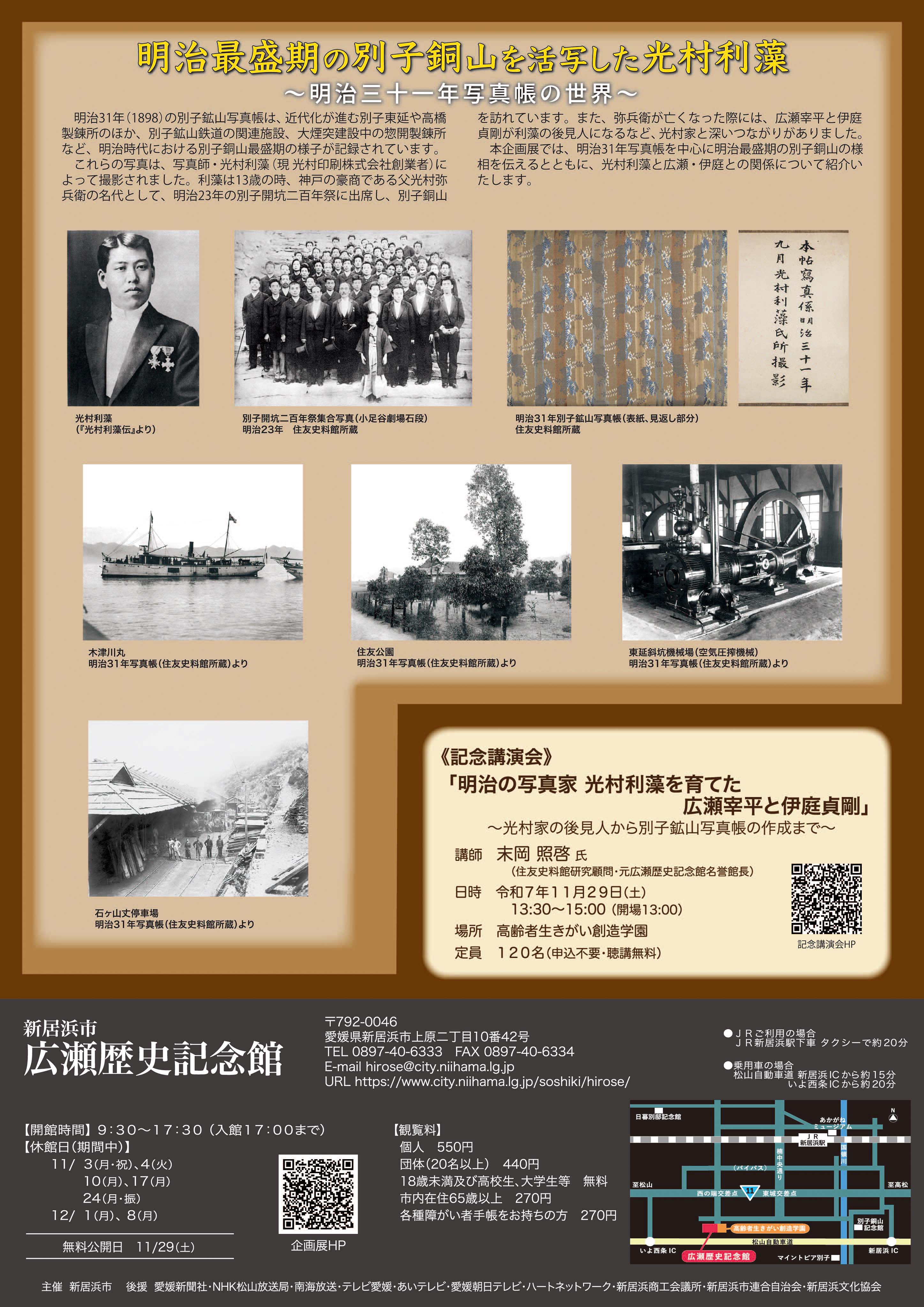 本展では、明治31年写真帳をもとに明治最盛期の別子銅山の様相を伝えるとともに、光村利藻と広瀬・伊庭の関係についても紹介する。