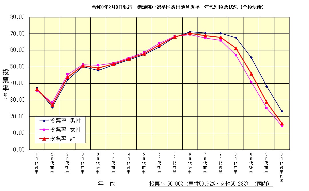 現在地 トップページ > 組織でさがす > 選挙管理委員会事務局 > 選挙管理委員会事務局 > 令和8年2月8日執行 衆議院議員総選挙及び最高裁判所裁判官国民審査 年齢別投票状況